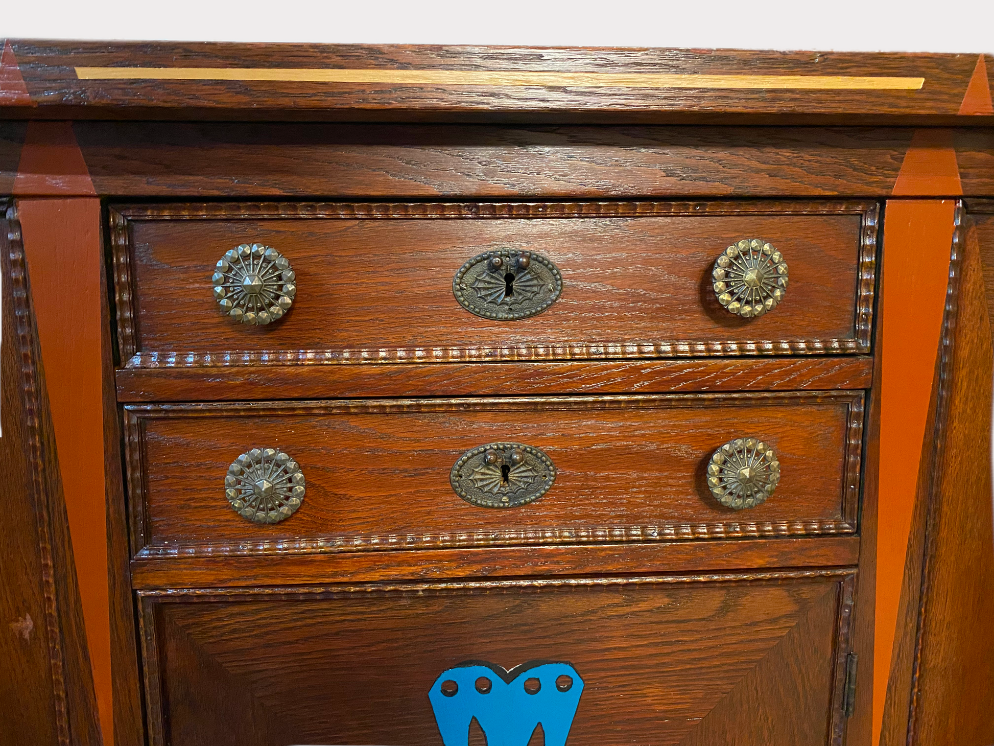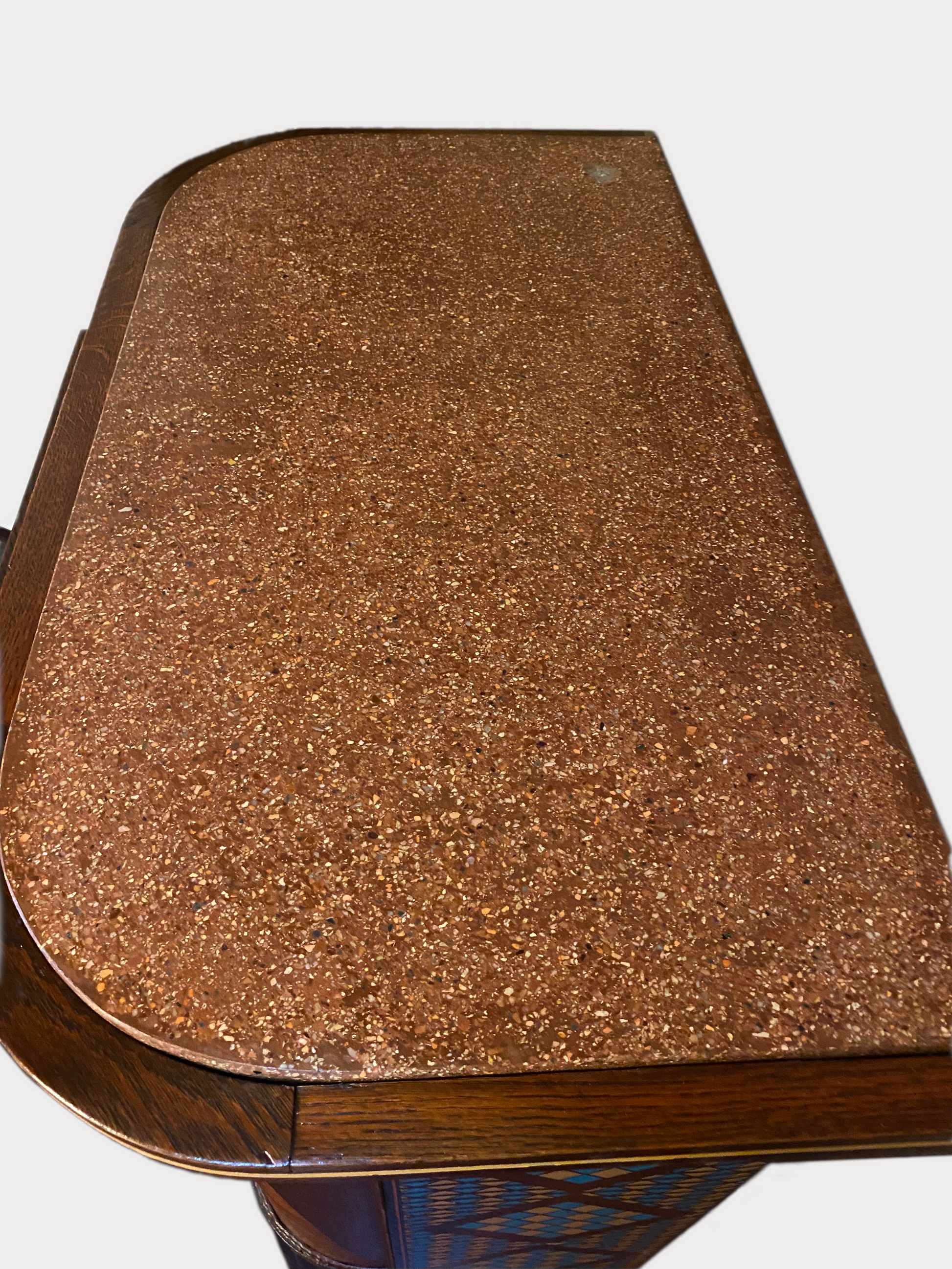 Stately and robust antique cabinet, expertly crafted with intricate joinery and hand-cut fasteners. Turquoise patterns on the face and sides contrast the professionally refinished wood, yielding a sophisticated southwest design. A courtly slab of natural stone nests into the top, resulting in a piece that is both beautiful and functional.